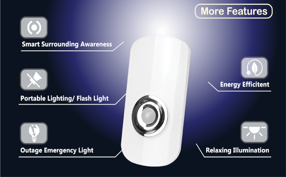 Specifications Sensor Degree: 60° Voltage: 110V AC 50/60Hz, 1.6W Battery: Li-Polymer, 3.7V, 500mAh Flashlight: 2 x 0.5W LED Flashlight Lighting Time: Up to 1.5 hours fully charged Emergency Lighting Time: Up to 2 hours fully charged Sensor Duration: 25 seconds Sensor Distance: 7 – 10 feet Charging Time: 8 – 10 hours Size: 5.12″ x 2.36″